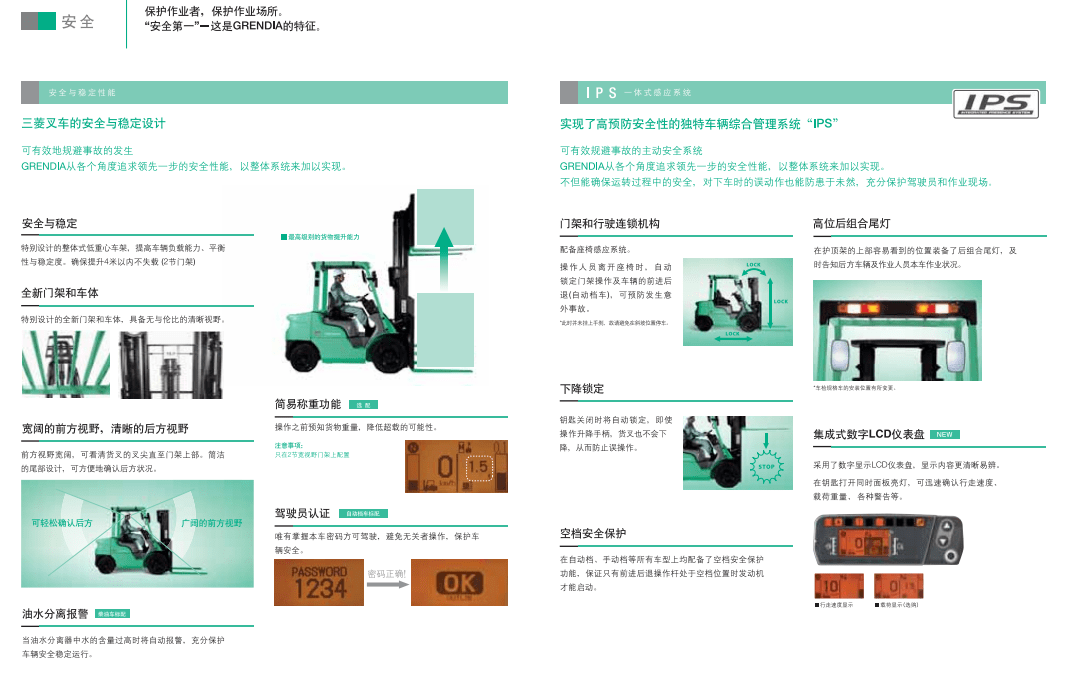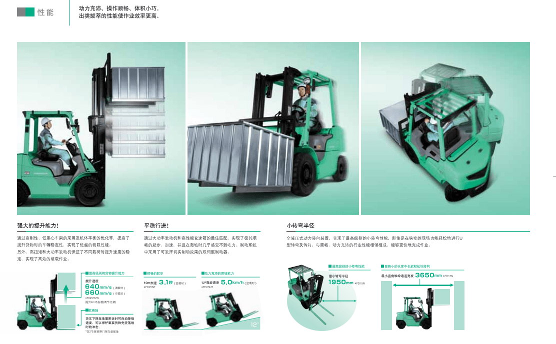 安全與穩定特別l計的整體式低重心車架。提高車輛負載統力。平衡性與穩定度。確保提升4米以內不失載2節門架)全新門架和車體特別授計的全新門架和車體,具備無與倫比的清晰視野。寬闊的前方視野,清晰的后方視野前方視野寬閑、可看清貨叉的叉尖直至門架上部。簡...