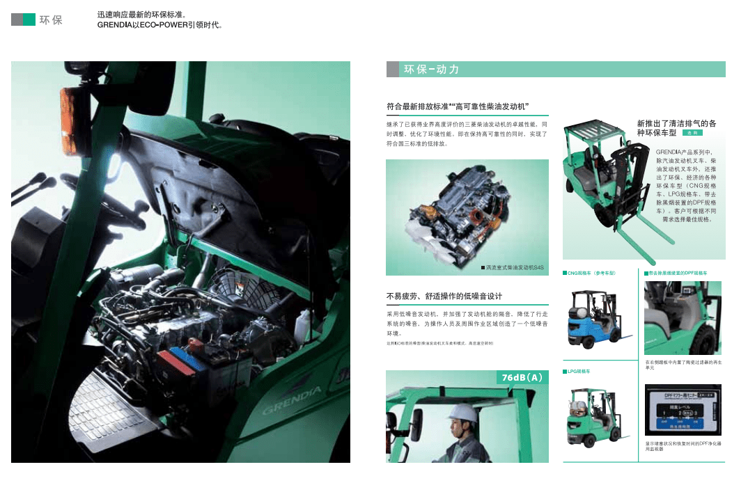 三菱叉車 GRENDIA 叉車 環保-動力符合最新排放標準"高可靠性柴油發動機繼承了已獲得業界高度評價的三菱榮油發動機的卓越性能,同時調整、優化了環境性能。即在保持高可靠性的同時、實現了符合國三標準的低排放。不易疲勞、舒適操作的低噪音設計采用低噪管...
