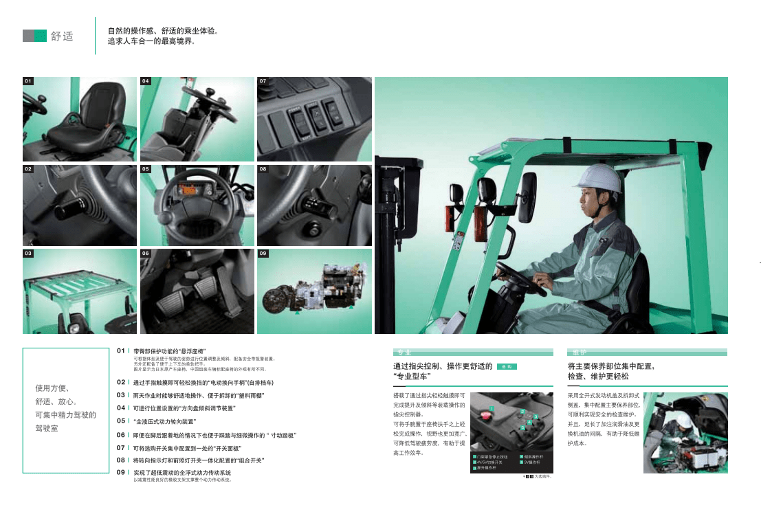 帶臂部保護功能的“懸浮座椅”通過手指觸摸即可輕松換擋的“電動換向手柄”雨天作業時能夠舒適地操作、便于拆卸的“塑料雨棚”可進行位置設置的"方向盤傾斜調節裝置"“全液壓式動力轉向裝置”即便在腳后跟著地的情況下也便于踩踏與潤微操作的“寸動...
