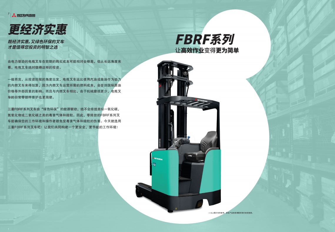 三菱叉車 FBRF系列前移式叉車 經濟實惠既經濟實惠,又綠色環保的叉車 才是值得您投資的明智之選由電力驅動的電瓶叉車在前期的購買成本可能相對會略高,但從長遠角度來看,電瓶叉車絕對值得這樣的投資。一般而言,從投資回報的角度出發,電瓶叉車遠比使用汽油或...
